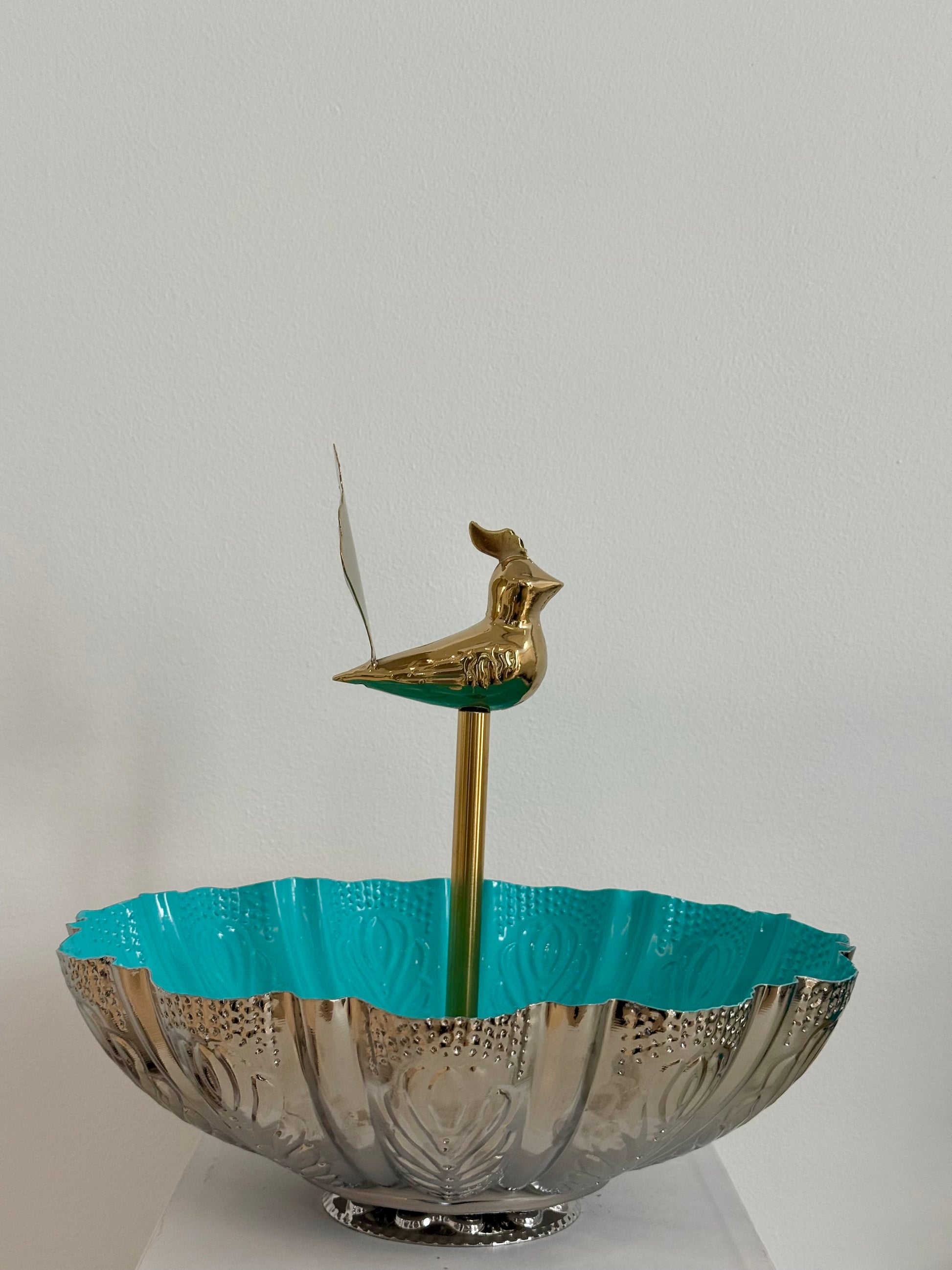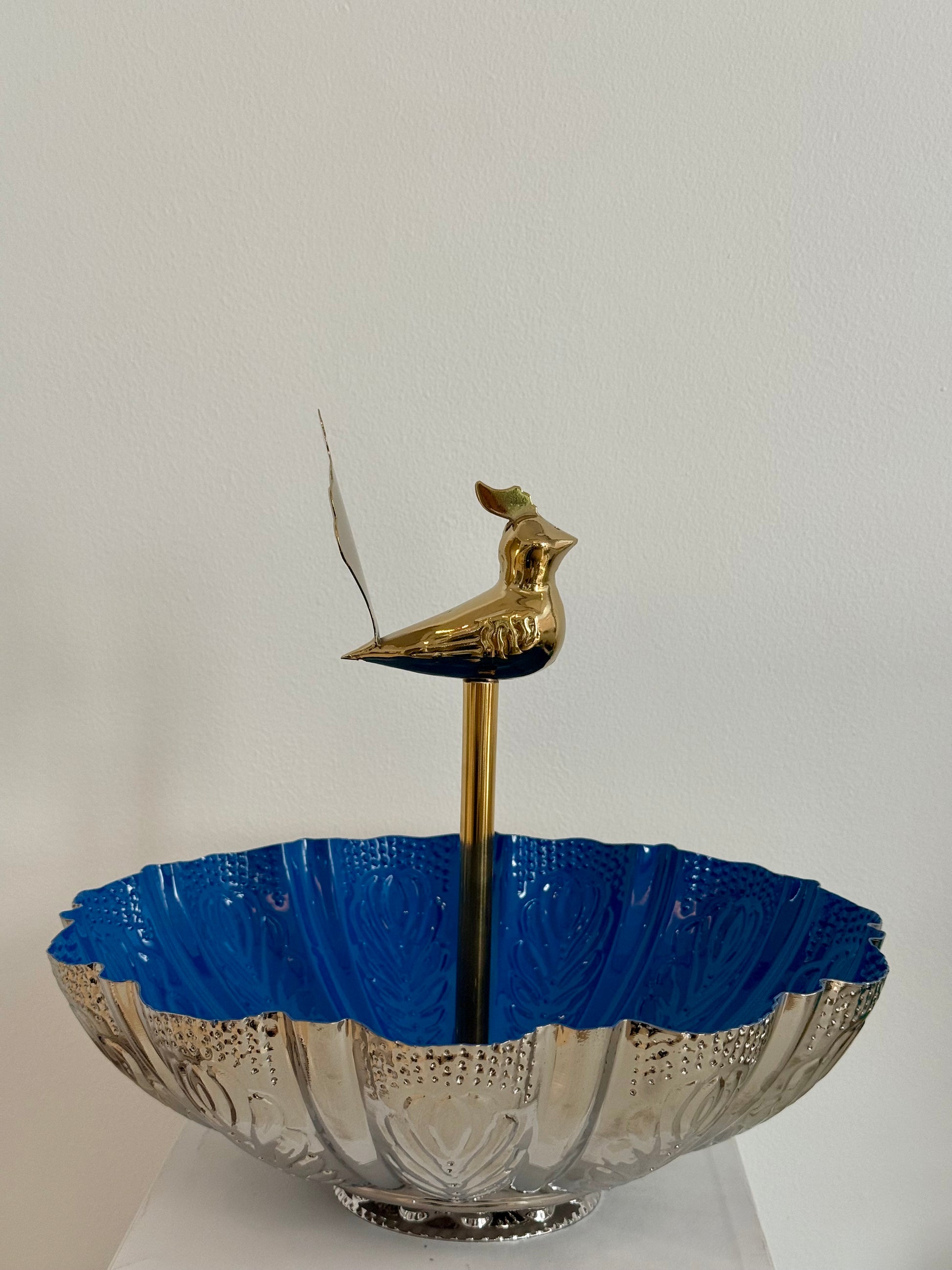 - A hand-crafted metal vessel with a sculptural golden bird handle and luminous blue interior. Designed as both a decorative piece and a functional bowl for fruits or everyday rituals. Finished with a food-safe protective coating.